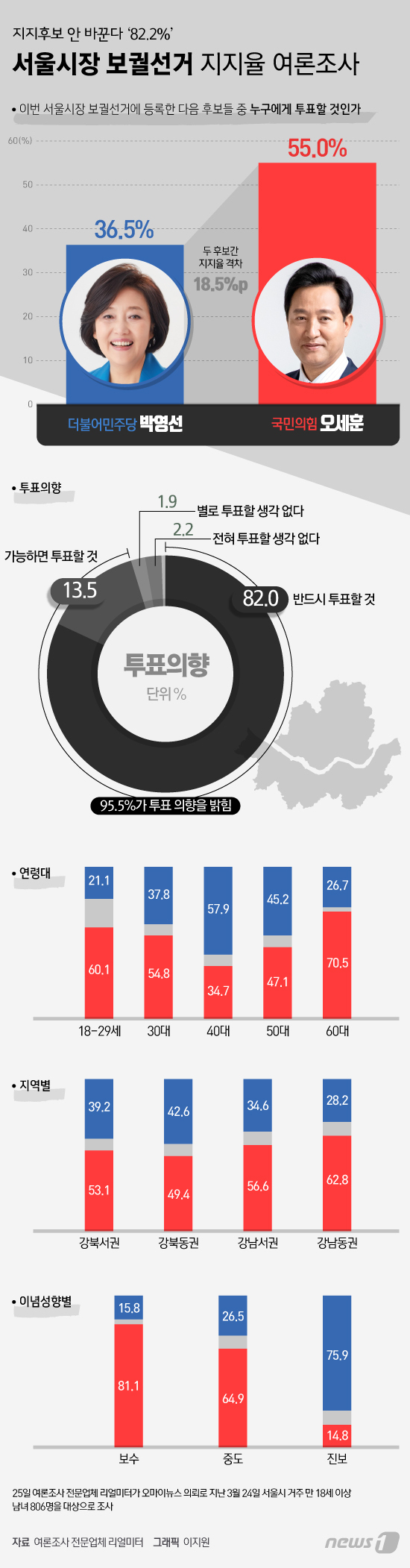 2021 재·보궐선거 공식 선거운동이 시작된 25일 오후 서울시장 후보들의 현수막이 서울 동작구 노량진역 인근에 걸려 있다. 주호영 당 꾸준히 여론조사, 압도적 차이 유지 판단 주호영 국민의힘 원내대표가 오는 7일 서울시장 보궐선거 전망과 관련해 당은 꾸준히 정밀한 여론조사를 한다며 압도적인 차이가 유지되거나 더. 4.7 서울시장 보궐선거 여론조사에서 20대가 오세훈 국민의힘 후보에 대한 압도적인 지지를 보낸다는 여론조사 결과가 25일 오세훈 서울시장 되면 '편파 논란' 교통방송과 '친문 상왕' 김어준 운명은? 선거 관련된 여론조사 결과를 담은 글 작성시 주의사항 28. 서울시장 보궐선거는 내년 4월 실시될 예정이다. 한때 윤석열 지지율 39.1%, 조사방식은 ars. 방금 서울시장 보궐선거 여론조사 왔는데 김진애 쪽에서 돌리는 건가봄. 10년 만의 귀환.4.7 서울시장 보궐선거의 승자, 오세훈이 다시 서울시장으로 돌아왔다.정확히는 만 9년 7개월 만이다. 특히 연령별로는 20대부터 60대 이상까지 모든 연령대에서 오. 서울시장 당선 가능성을 묻는 질문에는, 오 후보가 62.1%의 지지를 얻은 반면 박 후보는 28.2%를 얻으면서 격차는 더 벌어지는 모습이다. 7 여론조사 오차범위 내 결과 단정한. 6 '박형준 의혹' kbs 보도, 선거방송심의위 '문제없음'. 4·7 서울시장 재보선 여론조사40대도 돌아섰다.박영선<오세훈 머니투데이.